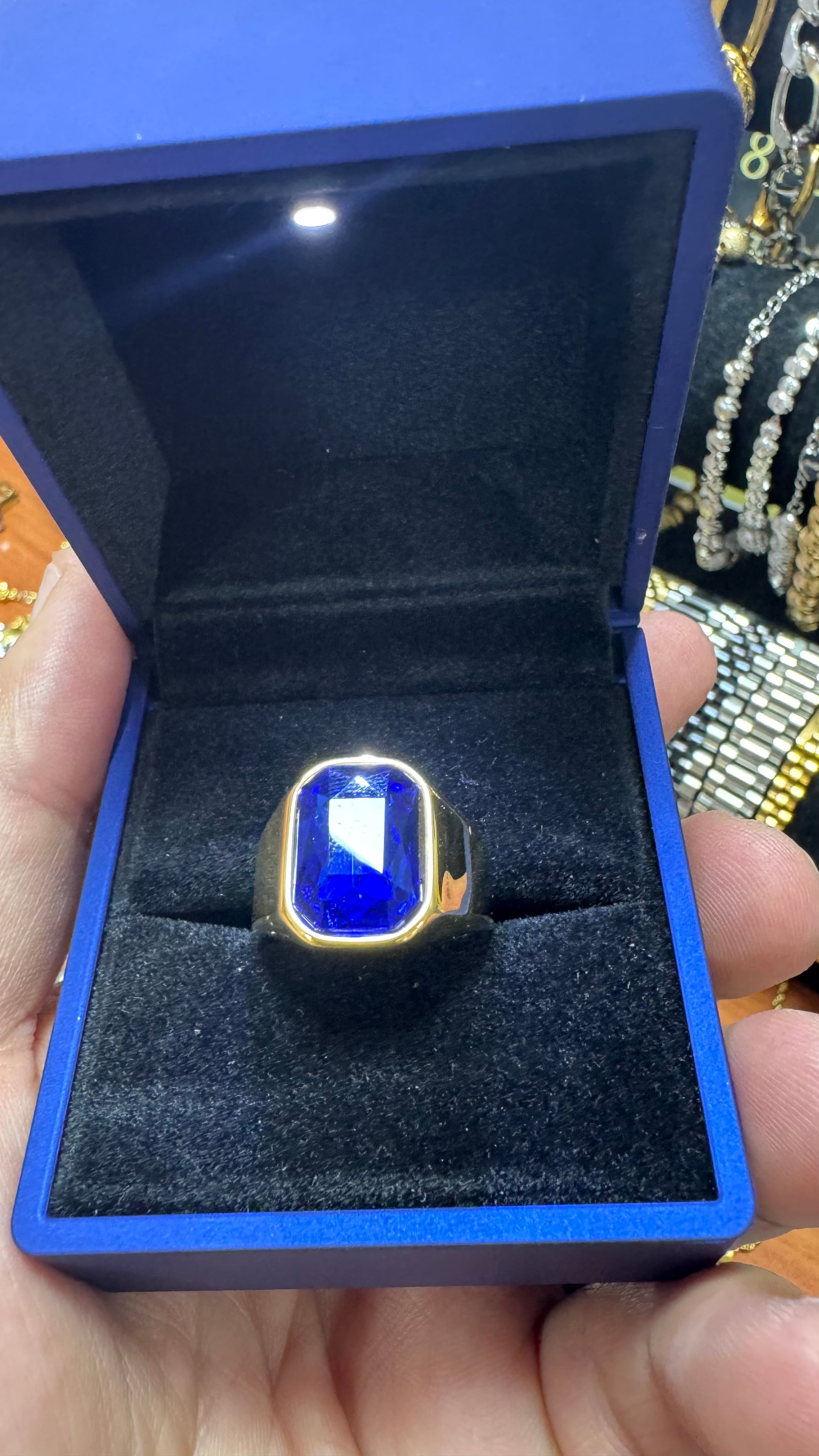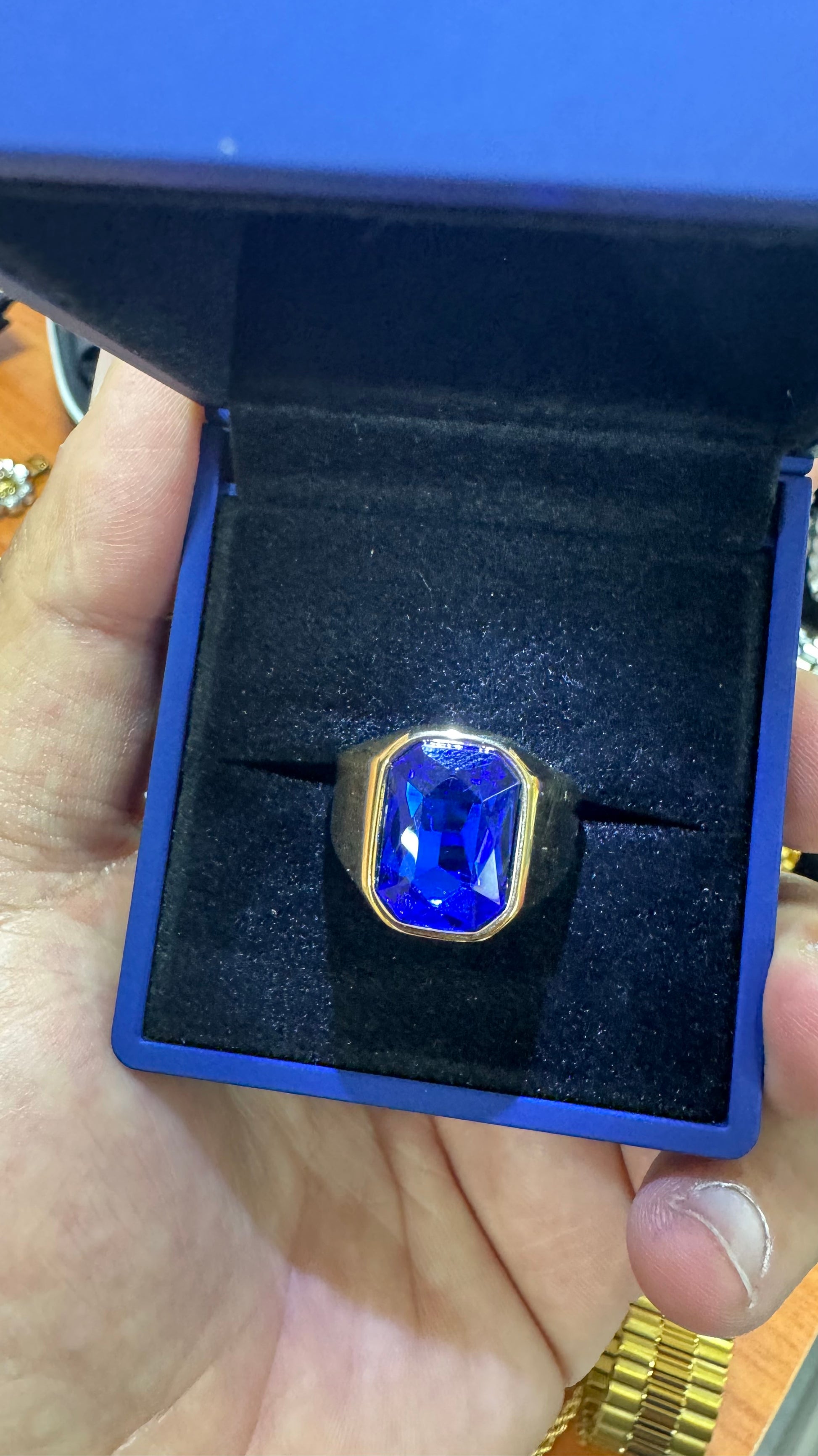 Anello acciaio colore oro con pietra quadrata blu royal unisex