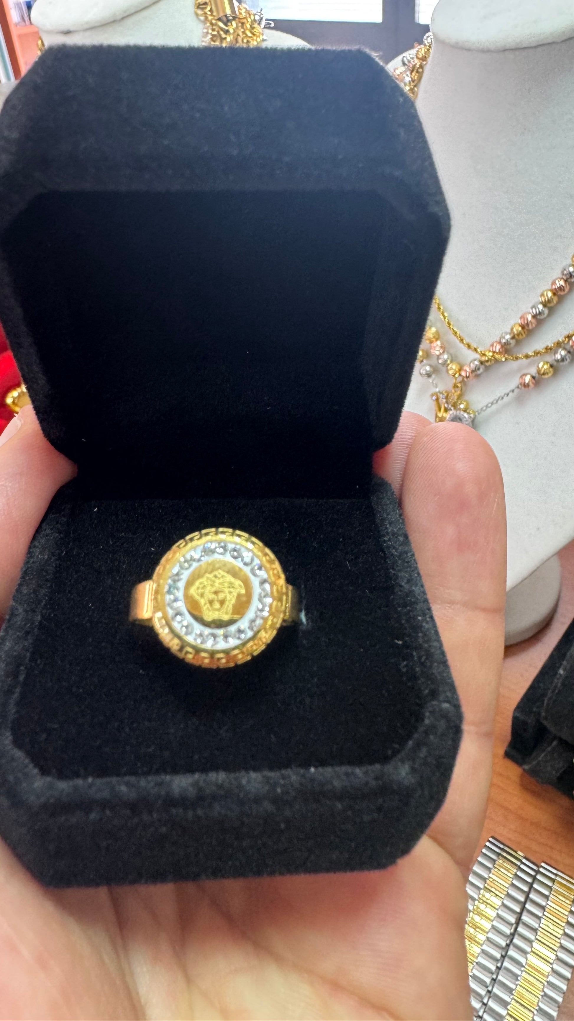 Anello regolabile con brillantini, modello medusa colore oro in acciaio unisex