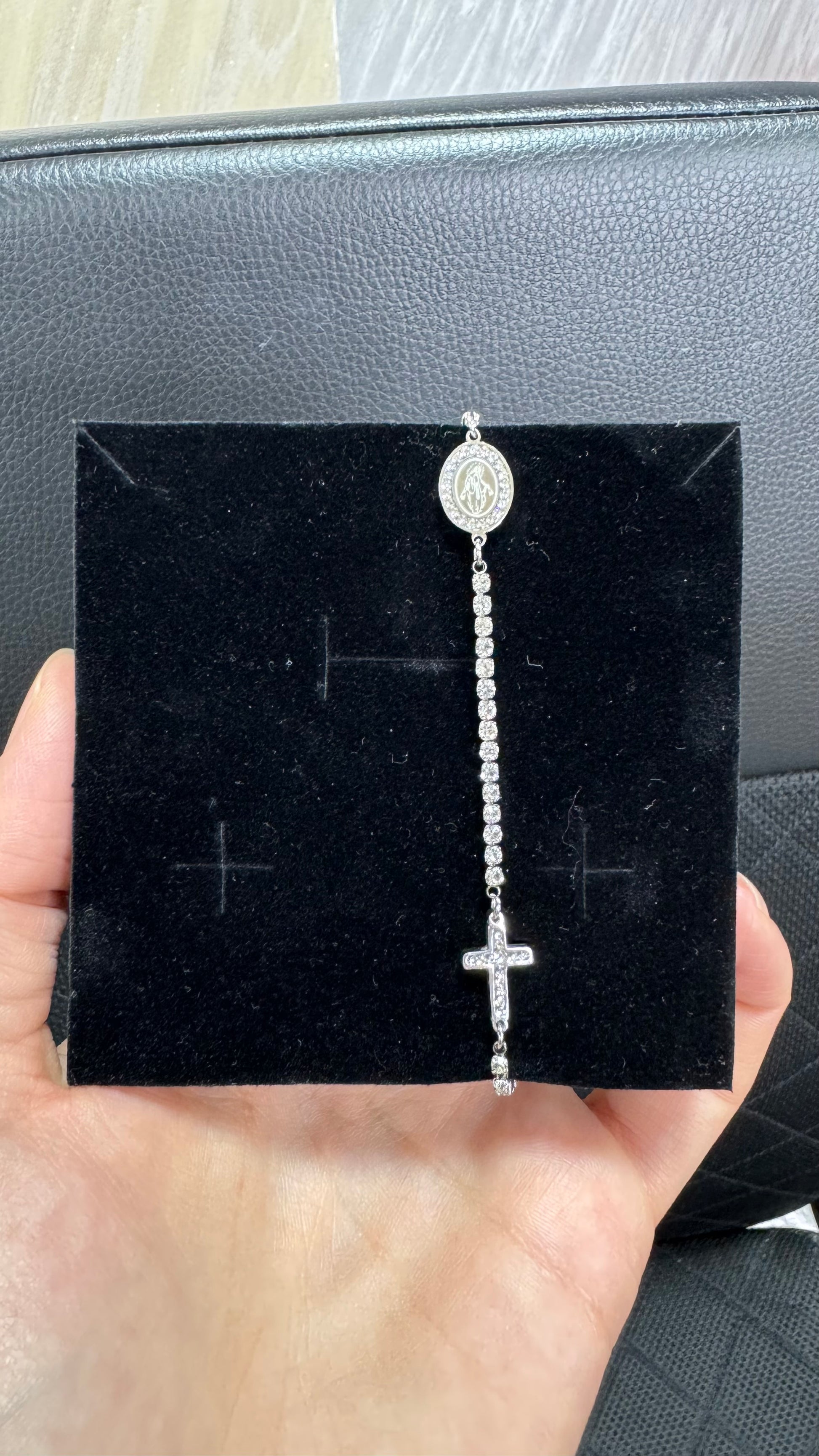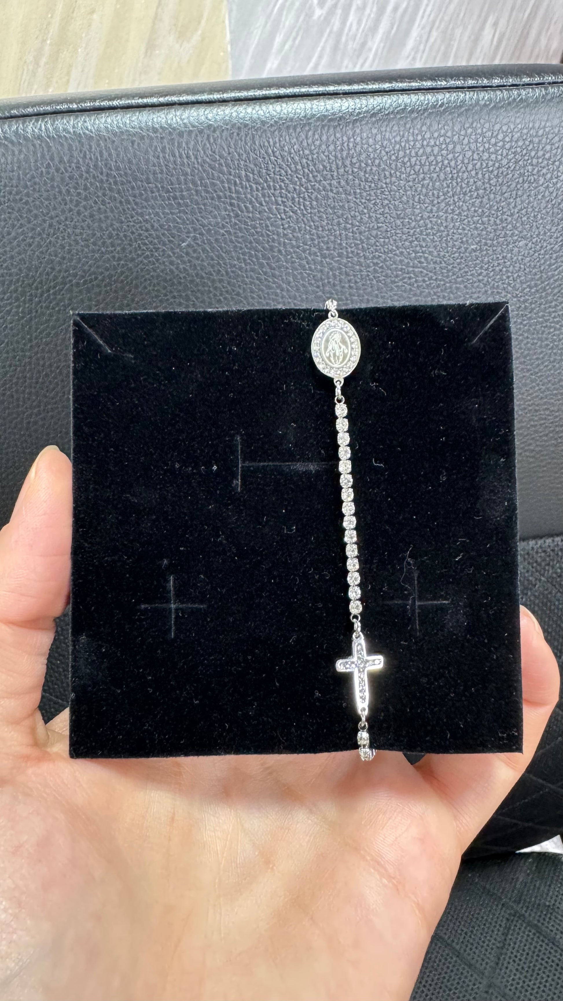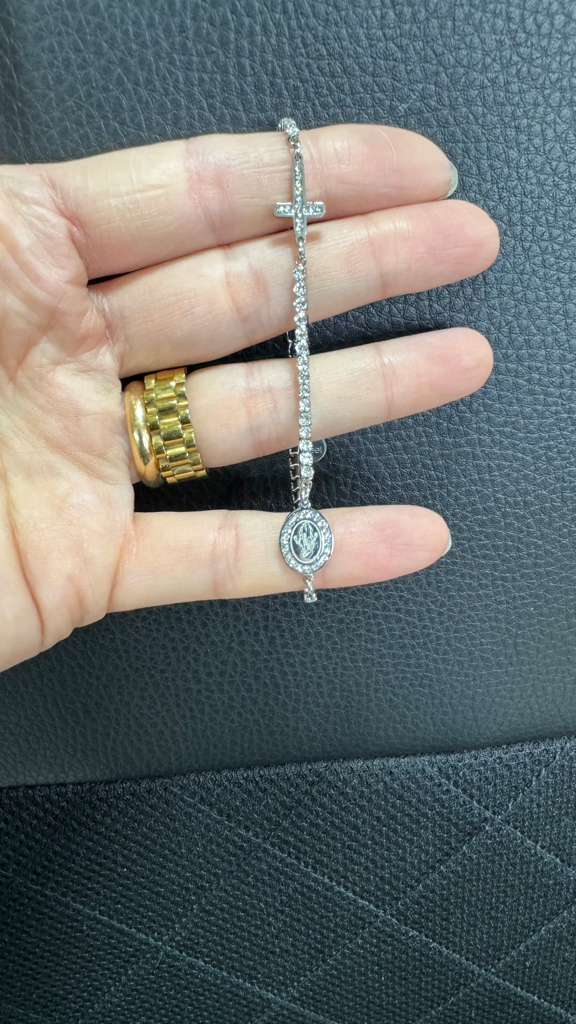 Bracciale a tennis colore argento in acciaio inossidabile con croce e madonnina , unisex .