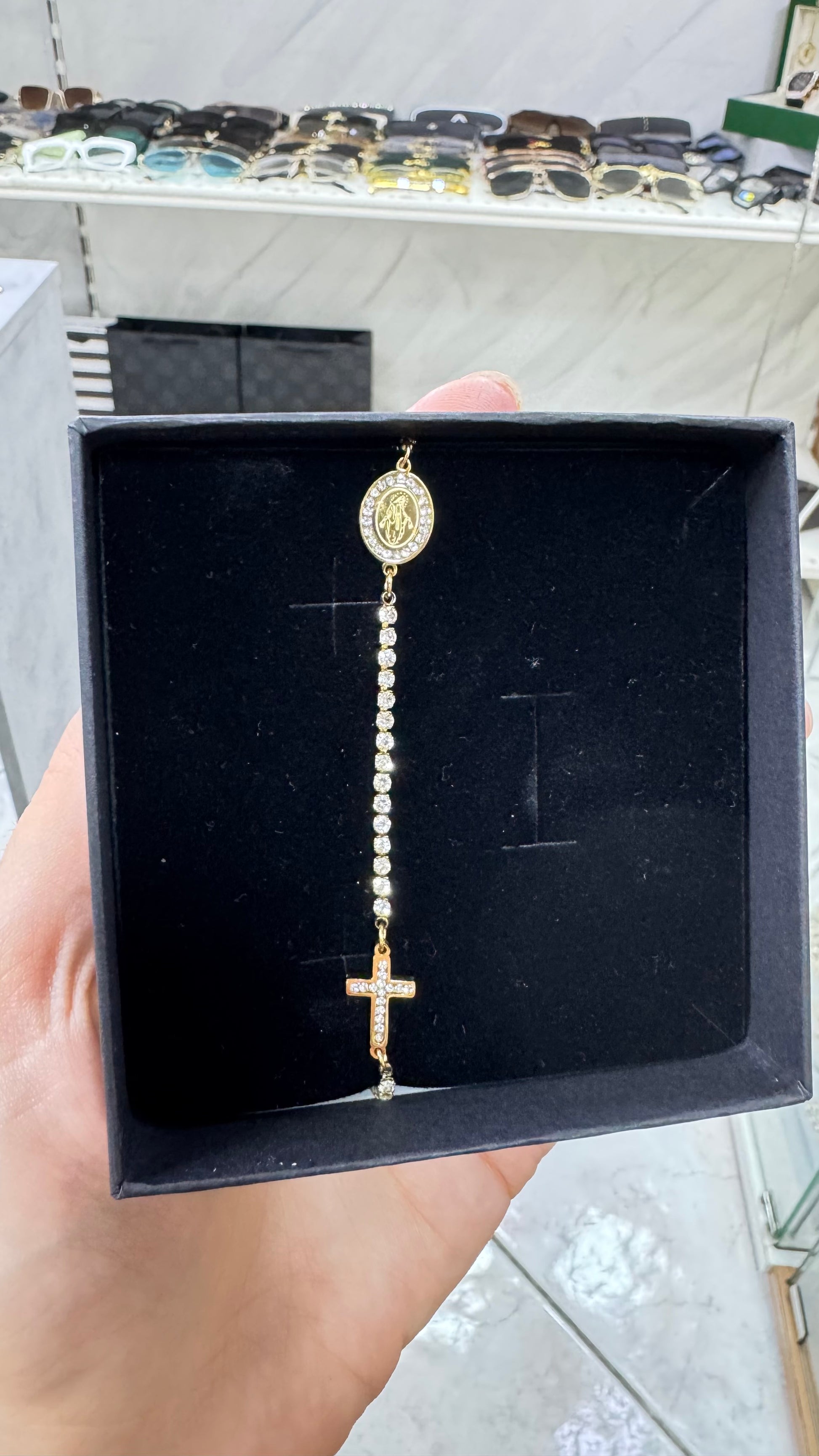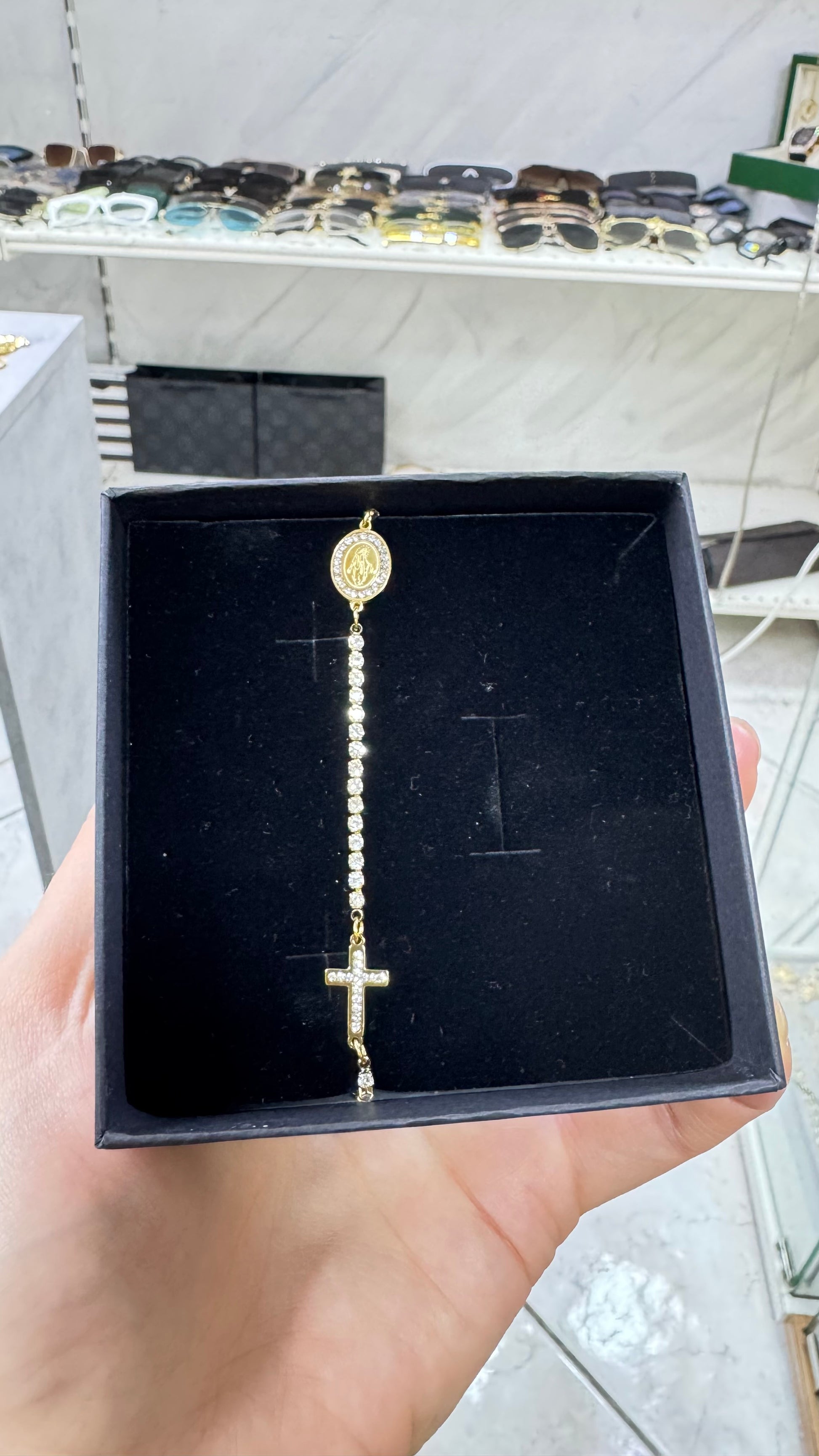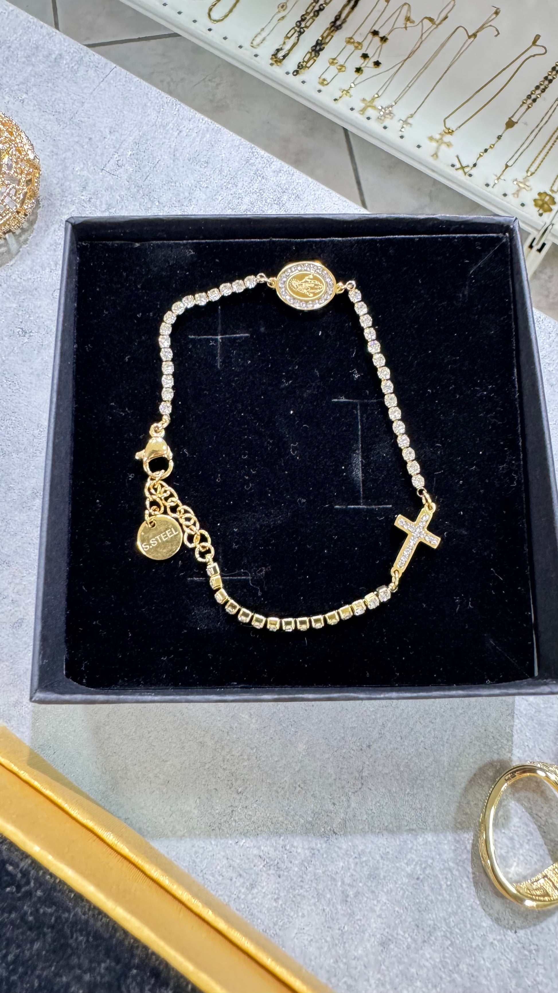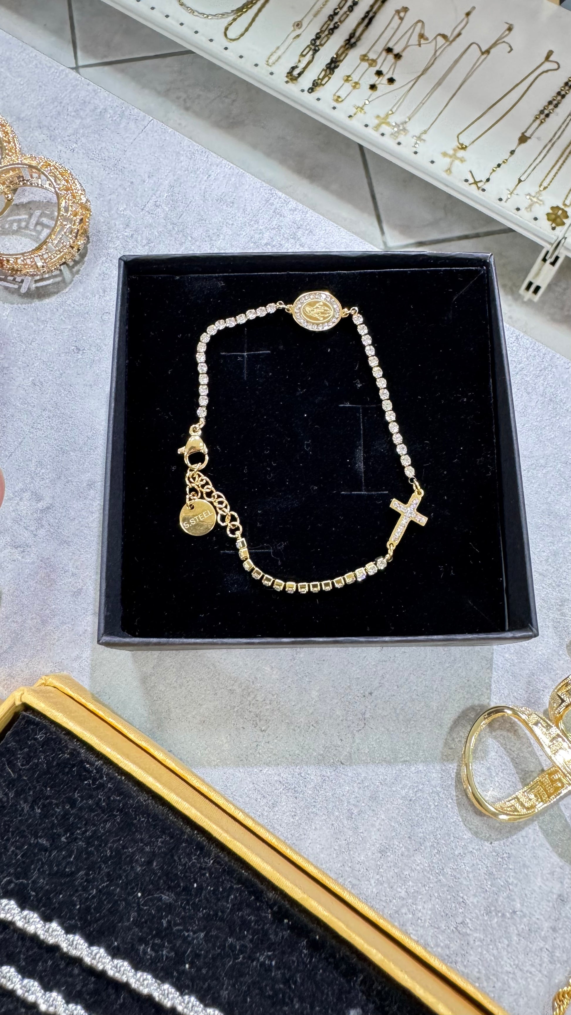 Bracciale tennis colore oro in acciaio inossidabile con croce e madonnina